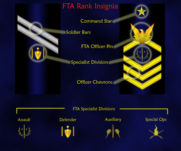 From the Ashes has a ranking system loosely based upon several real world military hierarchies. Mostly these ranks are just for fun. Rank isn't an indication of skill within any particular game, rather a degree of insight and leadership in our community structure. In general our higher ranking members contribute more ideas and time and have more access to clan resources. The specialty divisions roughly denote our preference and abilities in some game types.